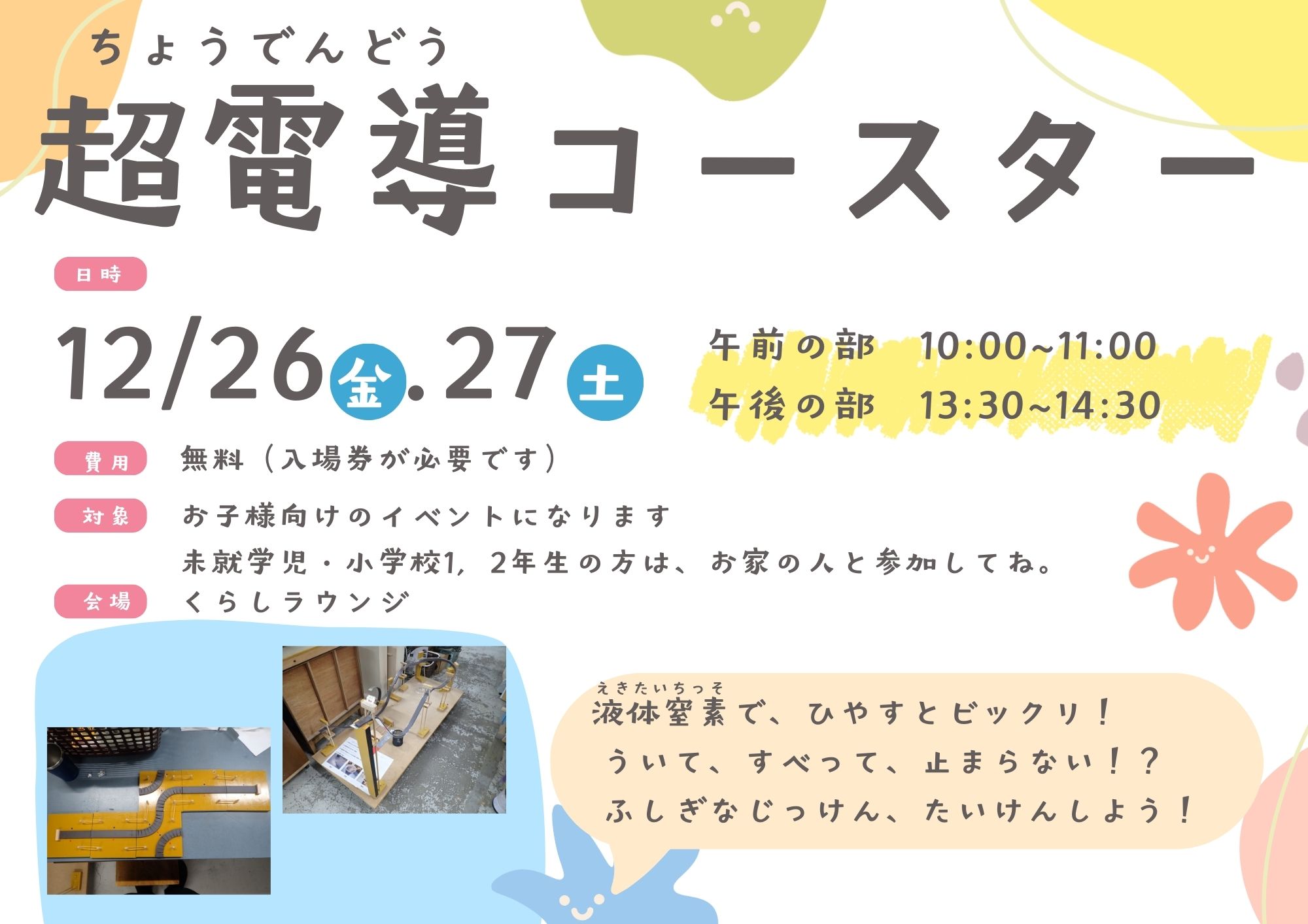 内容:液体窒素と超伝導体を使った、不思議な展示体験!スタッフと一緒に体験してみよう。